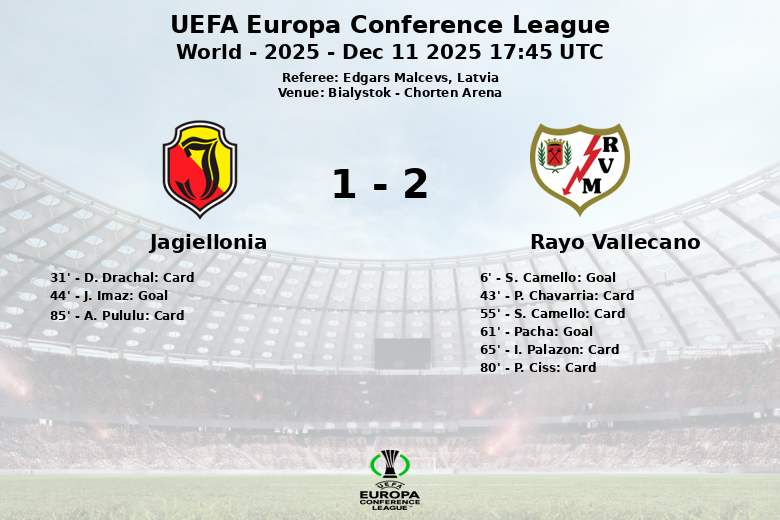O Rayo Vallecano empatou em 2-2 contra o Jagiellonia em um jogo disputado na Chorten Arena em Bialystok, correspondente à UEFA Europa Conference League. A partida, arbitrada pelo letão Edgars Malcevs, foi intensa e com domínio alternado.