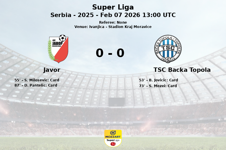 A partida foi marcada por faltas, com 16 cometidas pelo TSC Backa Topola e 13 pelo Javor. Os cartões amarelos também foram protagonistas, com dois para cada equipe. O árbitro advertiu B. Jovicic e S. Mezei pelo TSC Backa Topola, enquanto S. Milosevic e D. Pantelic viram o cartão pelo Javor. A partida terminou sem expulsões para nenhuma das equipes. Ambas as equipes batalharam até o final num jogo que não ficará para a história.