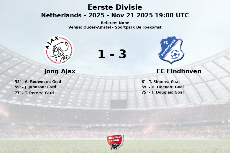 Ouder-Amstel, Países Baixos – Num emocionante encontro da Eerste Divisie realizado no Sportpark De Toekomst, o FC Eindhoven saiu vitorioso contra o Jong Ajax num jogo que manteve os adeptos em suspense. Apesar do Jong Ajax dominar a posse de bola com 62%, o FC Eindhoven provou ser mais eficaz em frente ao gol, capitalizando as suas oportunidades.