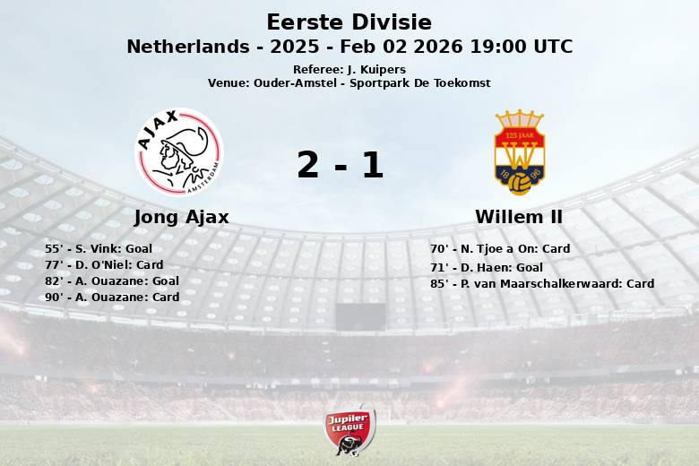 Ouder-Amstel, Países Baixos – Em uma partida disputada no Sportpark De Toekomst, Jong Ajax e Willem II empataram em um duelo que manteve os torcedores na ponta de seus assentos. Jong Ajax dominou a posse de bola com 59%, mas o Willem II mostrou-se perigoso no contra-ataque, gerando 11 chutes no total, em comparação com os 10 do seu rival.
