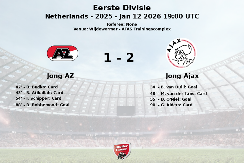 Apesar de dominar a posse de bola e gerar inúmeras chances, o Jong AZ só conseguiu descontar aos 88 minutos com um gol de R. Robbemond, assistido por S. Simons. O Jong Ajax defendeu sua vantagem com unhas e dentes até o apito final, garantindo uma valiosa vitória na Eerste Divisie. A partida terminou com um cartão amarelo para G. Alders do Jong Ajax aos 90 minutos. O Jong AZ recebeu 3 cartões amarelos na partida, enquanto o Jong Ajax recebeu apenas um.