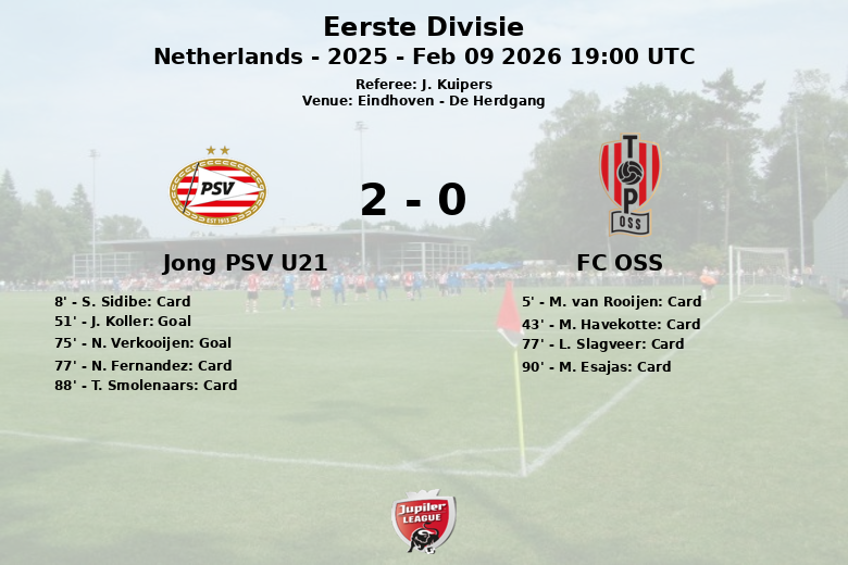 O Jong PSV U21 abriu o placar aos 51 minutos com um gol de J. Koller, assistido por A. Bouhamdi. Mais tarde, N. Verkooijen ampliou a vantagem aos 75 minutos com um gol assistido por N. Fernandez.