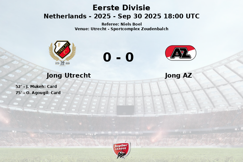 Utrecht, Países Baixos – Um encontro renhido e sem gols foi o que se viveu no Sportcomplex Zoudenbalch entre Jong Utrecht e Jong AZ, correspondente à nona jornada da Eerste Divisie. Apesar da intensa batalha no meio-campo, nenhuma das equipas conseguiu furar as redes rivais.