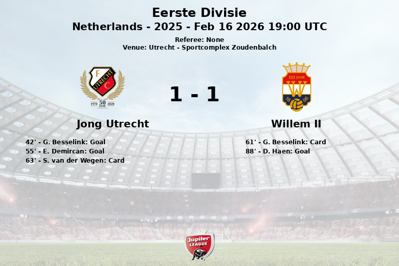 O primeiro gol veio inesperadamente aos 42 minutos, quando um gol contra de G. Besselink do Willem II deu a vantagem ao time da casa. No segundo tempo, aos 55 minutos, E. Demircan aumentou a vantagem para o Jong Utrecht após aproveitar um pênalti perdido, marcando no rebote. No entanto, a alegria não duraria muito, pois o Willem II começou a pressionar e, finalmente, aos 88 minutos, D. Haen marcou um gol, assistido por T. Verheydt, selando o empate final.