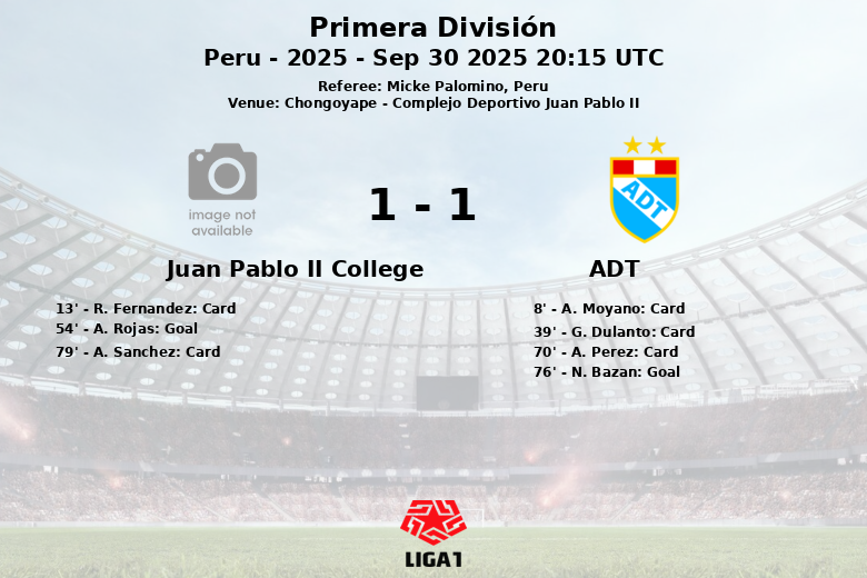 Um jogo disputado no Complejo Deportivo Juan Pablo II em Chongoyape terminou em um empate de 1 a 1 entre Juan Pablo II College e ADT, em uma partida correspondente à 12ª rodada do Apertura da Primeira Divisão Peruana. A partida, arbitrada por Micke Palomino, foi caracterizada por sua intensidade e vários cartões.