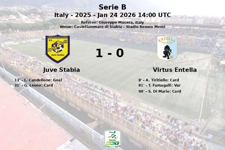 O primeiro tempo foi favorável ao Juve Stabia, que abriu o placar aos 13 minutos com um gol de L. Candellone, após uma jogada sem assistência. O jogo foi caracterizado por um jogo físico, refletido nos cartões amarelos mostrados a A. Tiritiello do Virtus Entella aos 8 minutos e a G. Leone do Juve Stabia aos 31 minutos.