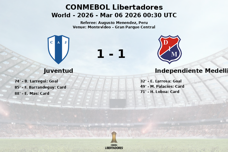 O Independiente Medellín abriu o placar aos 32 minutos com um gol de E. Larrosa, após uma jogada sem assistência. No entanto, o Juventud não se abateu e, após dominar a posse de bola com 57%, conseguiu empatar aos 74 minutos com um gol de B. Larregui.