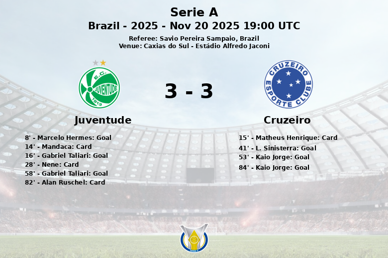 Caxias do Sul, Brasil – Em um jogo vibrante disputado no Estádio Alfredo Jaconi, o Juventude derrotou o Cruzeiro em partida válida pela 34ª rodada do Campeonato Brasileiro Série A. O jogo, arbitrado por Savio Pereira Sampaio, foi marcado por um ritmo alto e inúmeras chances de gol.