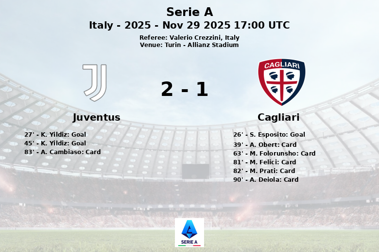 O Cagliari abriu o placar aos 26 minutos com um gol de S. Esposito, assistido por M. Palestra, surpreendendo a defesa da casa. No entanto, a alegria sarda durou pouco, pois K. Yildiz rapidamente empatou aos 27 minutos. O mesmo Yildiz mostrou seu faro de gol ao marcar novamente aos 45 minutos, pouco antes do intervalo, dando a vantagem à Juventus.