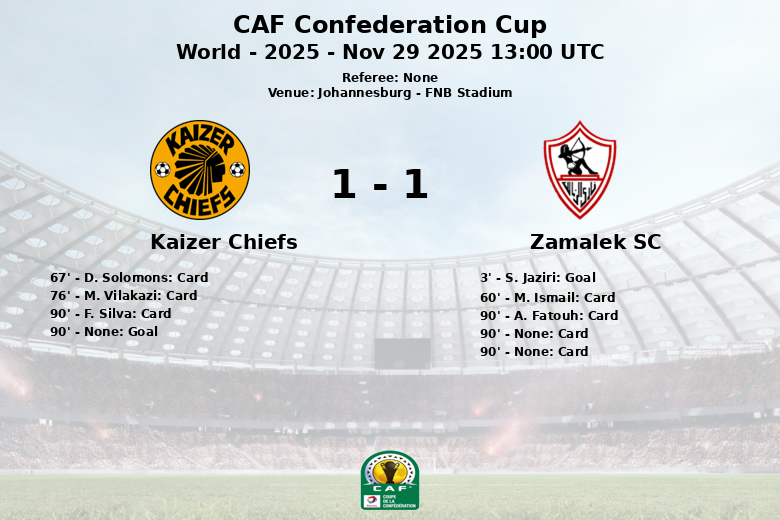 Joanesburgo, 29 de novembro de 2025 – Em um jogo disputado no FNB Stadium, Zamalek SC e Kaizer Chiefs empataram em partida válida pela CAF Confederation Cup. O Zamalek SC abriu o placar logo aos 3 minutos com um gol de S. Jaziri. Apesar do domínio na posse de bola por parte do Kaizer Chiefs (59% contra 41%), a equipe sul-africana lutou para encontrar o caminho do gol.
