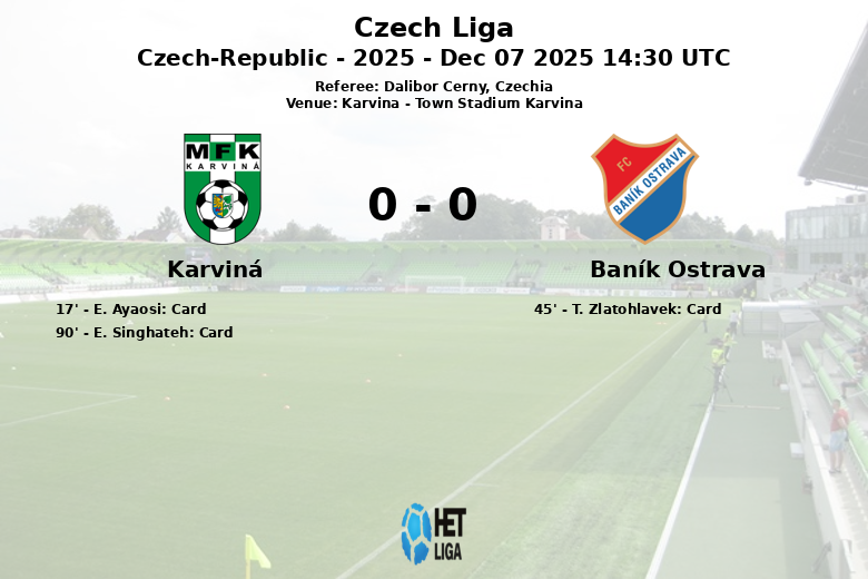 Substituiões na equipe de karviná: Aos 27 minutos, S. Bohac entrou e J. Chytry saiu., Aos 69 minutos, A. Labik entrou e R. Storman saiu., Aos 69 minutos, E. Ayaosi entrou e E. Singhateh saiu., Aos 90 minutos, J. Kristan entrou e J. Fiala saiu., Aos 90 minutos, A. Gning entrou e L. Ezeh saiu.
