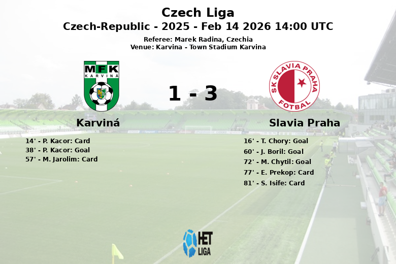 Num jogo realizado no Town Stadium Karvina, o Slavia Praga demonstrou sua superioridade contra o Karviná na Czech Liga, na 22ª rodada. A partida, arbitrada por Marek Radina, terminou com a vitória dos visitantes.