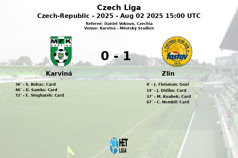 Karviná, República Checa – Um autogolo infeliz de J. Fleisman aos 4 minutos deu a vitória ao Zlin num jogo dominado na posse de bola pelo Karviná, que não conseguiu transformar o seu domínio em golos. O jogo, disputado no Městský Stadión, foi tenso, refletido nos inúmeros cartões e uma expulsão.