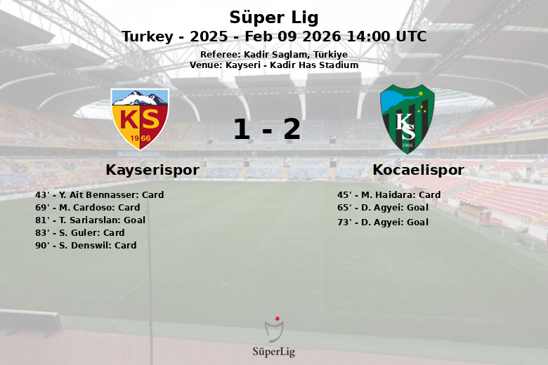 A ação se desenrolou no segundo tempo. Aos 65 minutos, D. Agyei, assistido por A. Oguz, abriu o placar para o Kocaelispor. Agyei marcou novamente aos 73 minutos, desta vez assistido por D. Churlinov, ampliando a vantagem dos visitantes. O Kayserispor tentou reagir e conseguiu diminuir a diferença aos 81 minutos com um gol de T. Sariarslan, assistido por C. Mane. Apesar da pressão no final, o Kayserispor não conseguiu empatar.