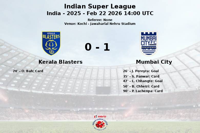 Kochi, Índia – Em uma partida disputada no Estádio Jawaharlal Nehru, o Mumbai City emergiu vitorioso contra o Kerala Blasters em um confronto da Superliga Indiana. Apesar do Kerala Blasters ter desfrutado de uma posse de bola de 56%, o Mumbai City demonstrou maior eficiência em frente ao gol.