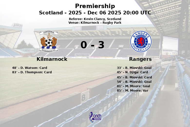 O Rangers abriu o marcador aos 33 minutos com um gol de B. Miovski, após uma assistência precisa de M. Diomande. O domínio do Rangers continuou, e Miovski reapareceu no marcador aos 54 minutos, desta vez assistido por N. Raskin, ampliando a vantagem para sua equipe. O Kilmarnock, embora tenha tentado reagir com 15 remates totais, só conseguiu direcionar 3 deles à baliza.