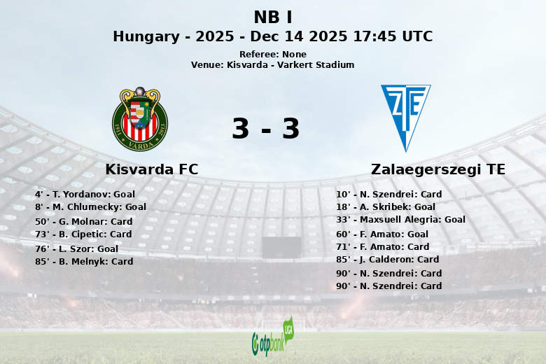 Um jogo cativante no Varkert Stadium em Kisvárda, como parte da 17ª rodada da NB I, viu Kisvárda FC e Zalaegerszegi TE empatarem em uma partida cheia de emoção e ação de ambas as partes. O Kisvárda FC começou o jogo com força, marcando dois gols nos primeiros oito minutos, cortesia de T. Yordanov e M. Chlumecky, o último assistido por Yordanov. No entanto, o Zalaegerszegi TE respondeu rapidamente, diminuindo com um gol de A. Skribek aos 18 minutos, assistido por G. Bodnar. O empate veio aos 33 minutos, com um gol de Maxsuell Alegria. No segundo tempo, F. Amato colocou o Zalaegerszegi TE à frente aos 60 minutos, também assistido por Bodnar. Quando parecia que a vitória estava indo para o Zalaegerszegi, L. Szor marcou para o Kisvárda aos 76 minutos, fazendo 3-3 com assistência de A. Jovicic. A partida foi intensa e disputada, com um total de 9 cartões amarelos e um cartão vermelho para o Zalaegerszegi TE. O Kisvárda FC teve 47% de posse de bola e fez 9 remates, enquanto o Zalaegerszegi TE dominou a posse com 53% e fez 16 remates.
