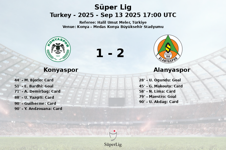 O Alanyaspor abriu o placar aos 28 minutos com um gol de U. Ogundu, assistido por E. Keskin. O Konyaspor respondeu no segundo tempo, empatando a partida aos 51 minutos com um gol de E. Bardhi, assistido por Y. Andzouana. O jogo permaneceu equilibrado até que Maestro, do Alanyaspor, colocou sua equipe à frente novamente aos 79 minutos, graças a uma assistência de U. Ogundu.