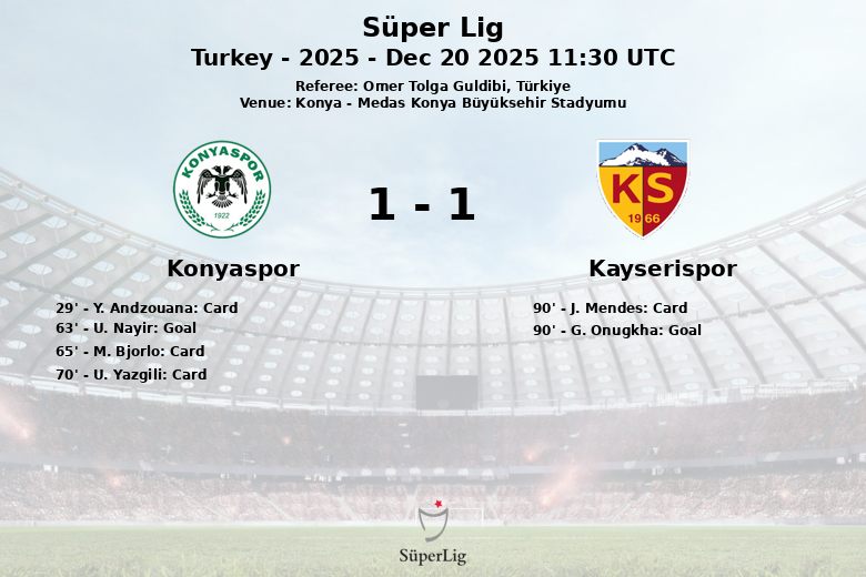 A partida permaneceu sem gols até os 63 minutos, quando U. Nayir, assistido por M. Bjorlo, abriu o placar para o Konyaspor. No entanto, nos acréscimos, aos 90 minutos, G. Onugkha, com assistência de T. Sariarslan, igualou o placar para o Kayserispor, deixando os torcedores da casa com um gosto amargo.