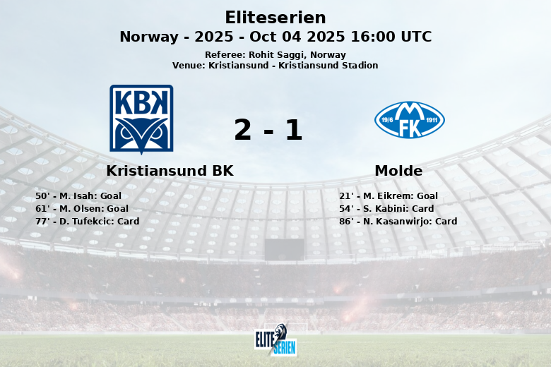 Apesar do controle do Molde, o Kristiansund BK demonstrou ser mais eficaz na frente do gol. M. Eikrem abriu o placar para o Molde aos 21 minutos, com assistência de S. McDermott. No entanto, o Kristiansund BK respondeu no segundo tempo. M. Isah empatou aos 50 minutos, com assistência de D. Tufekcic. A virada foi concluída aos 61 minutos, graças a um gol de M. Olsen, com assistência de A. Kryger.
