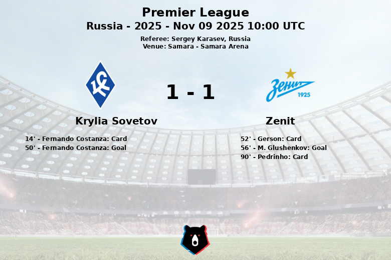 A partida foi marcada logo cedo por um cartão amarelo para Fernando Costanza do Krylia Sovetov aos 14 minutos. No segundo tempo, o jogo ganhou vida. Costanza se redimiu ao marcar para o Krylia Sovetov aos 50 minutos, provocando euforia na torcida local. No entanto, a alegria durou pouco, já que M. Glushenkov igualou para o Zenit aos 56 minutos. Apesar das tentativas de ambas as equipes, o placar não se alterou mais, culminando em um empate que deixa um sabor agridoce para ambos os lados. O Zenit dominou na posse de bola e chutes a gol (5 contra 2), mas não conseguiu convertê-los em gols. A partida foi salpicada com cartões amarelos, um para cada equipe com Gerson (52′) e Pedrinho (90′) do Zenit e o cartão de Costanza do Krylia Sovetov.