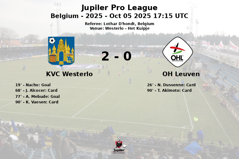 A partida começou com o Westerlo dominando a posse de bola, alcançando 52%. Como resultado desse domínio, Nacho abriu o placar aos 19 minutos, desencadeando euforia nas arquibancadas. O OH Leuven tentou reagir, mas encontrou uma defesa bem posicionada e um jogo de posse de bola que dificultou a geração de oportunidades claras. A tensão era palpável em campo, o que resultou em um cartão amarelo para N. Dussenne do OH Leuven aos 26 minutos.