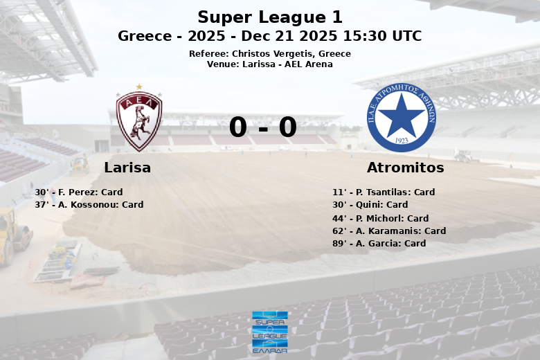 O encontro foi repleto de advertências. O árbitro Christos Vergetis mostrou cinco cartões amarelos para o Atromitos e dois para o Larisa, refletindo a intensidade com que ambas as equipes disputaram cada bola. O Atromitos também superou o Larisa em escanteios com 4 contra 1. O Larisa cometeu nove faltas, enquanto o Atromitos cometeu sete.
