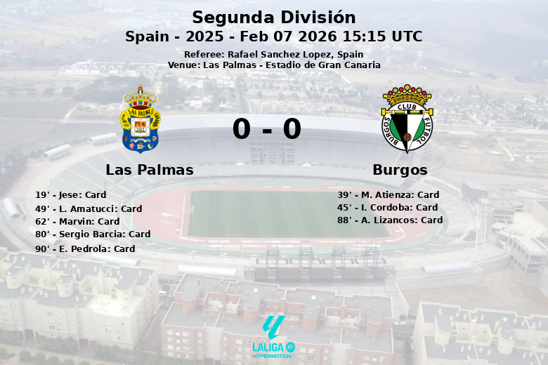 Las Palmas e Burgos CF empataram em 0-0 no Estádio de Gran Canaria, num jogo da 25ª jornada da Segunda División. A equipa da casa, Las Palmas, dominou amplamente a posse de bola com 66%, gerando um total de 16 remates, dos quais 6 foram à baliza. No entanto, a defesa bem organizada do Burgos e a falta de contundência no ataque impediram que o marcador se alterasse.
