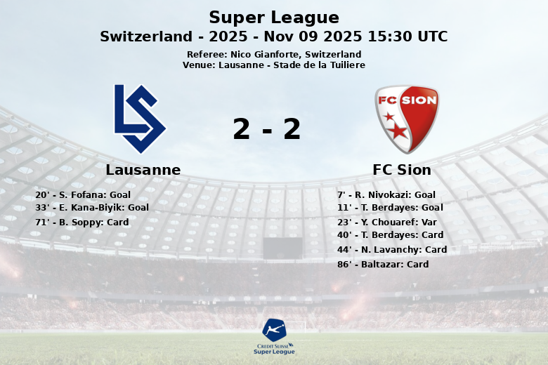 Lausanne e FC Sion protagonizaram um empate vibrante no Stade de la Tuilière, num jogo cheio de emoção e reviravoltas. O FC Sion começou forte, abrindo o placar com um gol de R. Nivokazi aos 7 minutos, com assistência de N. Hefti, seguido rapidamente por outro gol de T. Berdayes aos 11 minutos, também com assistência de Hefti. No entanto, o Lausanne reagiu, descontando aos 20 minutos com um gol de S. Fofana, após assistência de G. Diakite.