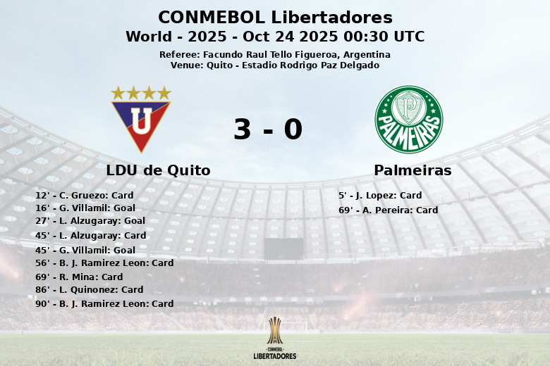 Desde o início, o jogo foi físico, com cartões amarelos logo no começo para J. Lopez do Palmeiras e C. Gruezo da LDU. Aos 16 minutos, G. Villamil abriu o placar para a LDU com um gol após assistência de L. Quinonez. A vantagem foi ampliada aos 27 minutos, graças a um pênalti convertido por L. Alzugaray. Pouco antes do intervalo, G. Villamil marcou novamente, desta vez com assistência de B. J. Ramirez Leon, consolidando o domínio da LDU.