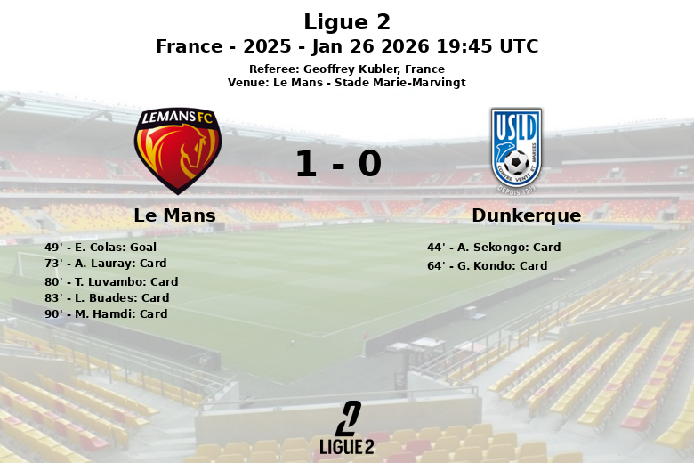 O Le Mans garantiu uma vitória sobre o Dunkerque em seu jogo da Ligue 2, realizado em 26 de janeiro de 2026, no Stade Marie-Marvingt. A partida, marcada por inúmeras faltas e cartões amarelos, foi decidida por um único gol de E. Colas aos 49 minutos.