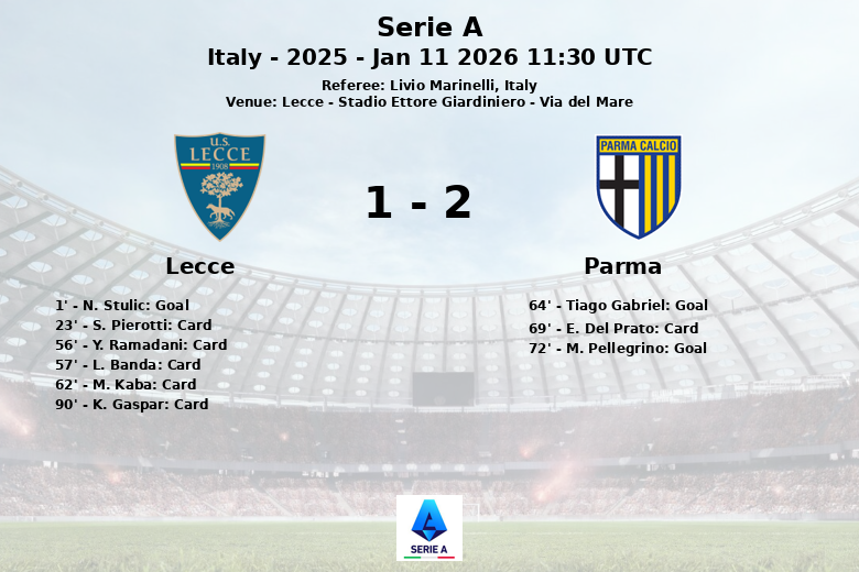 O ponto de virada veio com a expulsão de L. Banda aos 57 minutos, deixando o Lecce com dez jogadores. O Parma aproveitou a superioridade numérica e conseguiu empatar com um gol contra de Tiago Gabriel aos 64 minutos. A situação ficou ainda mais complicada para o Lecce com a expulsão de K. Gaspar aos 90 minutos. Anteriormente, M. Pellegrino havia colocado o Parma em vantagem aos 72 minutos, assistido por A. Bernabe.