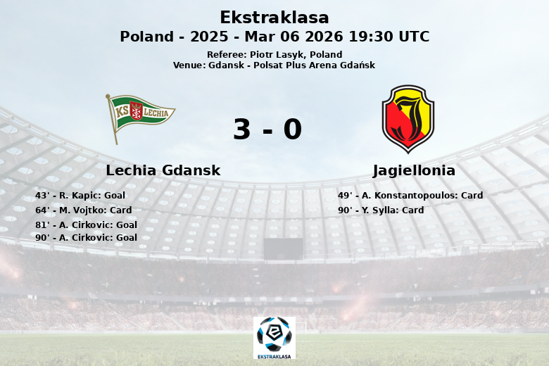 Gdansk, Polônia – Em um jogo correspondente à 24ª rodada da Ekstraklasa, o Lechia Gdansk alcançou uma importante vitória em casa contra o Jagiellonia. A partida, disputada no Polsat Plus Arena Gdańsk e arbitrada por Piotr Lasyk, terminou com um placar favorável à equipe da casa.