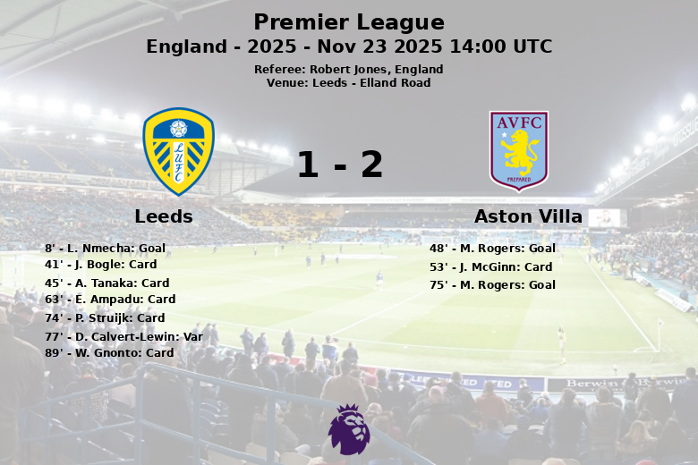 O Leeds abriu o placar logo no início, com um gol de L. Nmecha aos 8 minutos. No entanto, o Aston Villa respondeu no segundo tempo. M. Rogers empatou aos 48 minutos, com assistência de D. Malen, e depois selou a vitória aos 75 minutos.