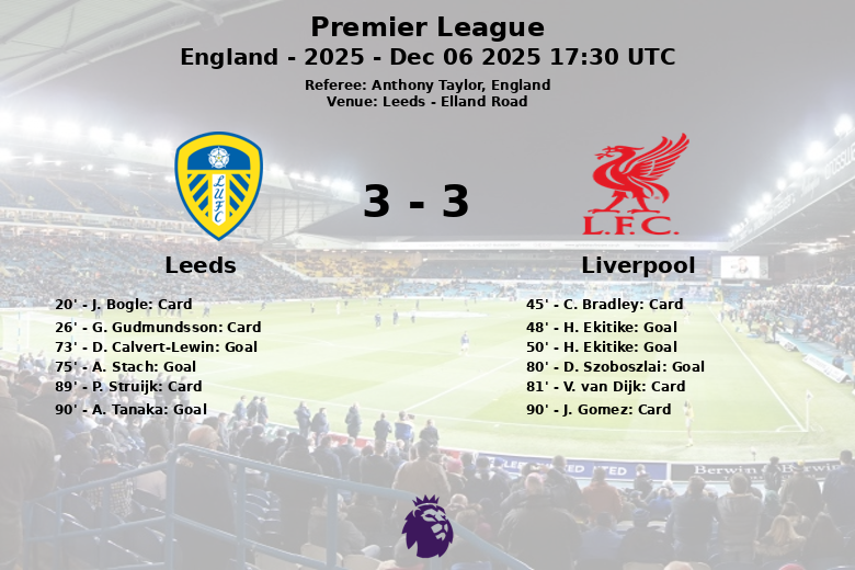O Liverpool abriu o placar no segundo tempo com dois gols de H. Ekitike aos 48 e 50 minutos, colocando o placar em 2 a 0. No entanto, o Leeds reagiu com determinação e conseguiu empatar o placar com um pênalti convertido por D. Calvert-Lewin aos 73 minutos e um gol de A. Stach aos 75 minutos. Quando a partida parecia caminhar para um empate, D. Szoboszlai marcou para o Liverpool aos 80 minutos. Mais tarde na partida A. Tanaka marcou para o Leeds aos 90 minutos fazendo o placar final 3 a 3.