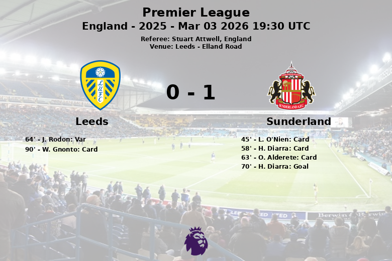 O jogo foi repleto de incidentes, incluindo quatro cartões amarelos mostrados (três para o Sunderland e um para o Leeds), e um gol anulado para o Leeds por impedimento após revisão do VAR, causando considerável controvérsia no estádio. O Sunderland, apesar de ter menos posse de bola, mostrou-se eficiente, convertendo uma de suas poucas oportunidades de marcar através de um pênalti aos 70 minutos. O Leeds, apesar de seu domínio territorial e oito escanteios a seu favor, não conseguiu capitalizar sua superioridade e foi frustrado pela defesa sólida do Sunderland. A partida, arbitrada por Stuart Attwell, foi pontuada por faltas (19 do Sunderland e 15 do Leeds), refletindo a intensidade e a constante batalha no meio-campo.