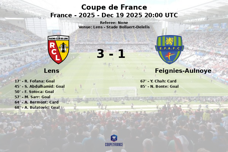 O Feignies-Aulnoye, apesar da diferença no placar, não desistiu e conseguiu marcar um gol aos 85 minutos, de N. Bonte, com assistência de M. Cisse. No entanto, este gol não foi suficiente para mudar o curso da partida. O Lens demonstrou sua força ofensiva, com 23 chutes no total (9 no alvo e 8 para fora) e 11 escanteios, enquanto o Feignies-Aulnoye mal conseguiu gerar 5 chutes (2 no alvo e 2 para fora) e apenas um escanteio. A partida foi disputada como parte da Copa da França em sua fase de 64 avos de final na temporada de 2025.