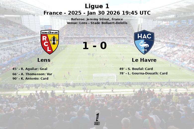 Lens, França – Num jogo disputado no Stade Bollaert-Delelis, o Lens conseguiu superar o Le Havre com um placar de 1-0 em uma partida correspondente à 20ª rodada da Ligue 1. O único gol da partida aconteceu pouco antes do intervalo, aos 45 minutos, quando R. Aguilar, assistido por M. Udol, furou as redes adversárias.
