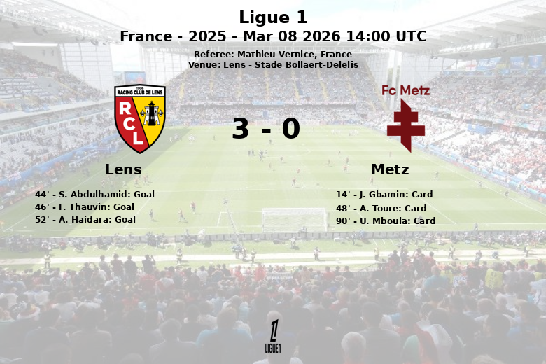 O Lens demonstrou sua superioridade contra o Metz com uma vitória convincente no Stade Bollaert-Delelis. A partida, válida pela 25ª rodada da Ligue 1, foi arbitrada por Mathieu Vernice.