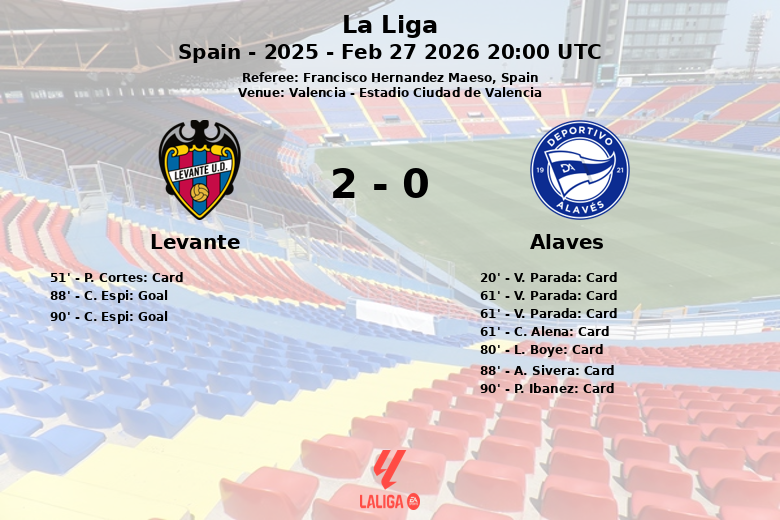 O primeiro tempo passou sem gols, mas com um cartão amarelo para V. Parada do Alavés. O segundo tempo foi mais agitado. P. Cortes do Levante recebeu uma advertência, e a situação ficou ainda mais complicada para o Alavés com a expulsão de V. Parada após receber seu segundo cartão amarelo. O jogo brusco continuou, resultando em mais advertências para ambas as equipes, incluindo C. Alena e L. Boye do Alavés, e um cartão nos minutos finais para A. Sivera e P. Ibanez também do Alavés.