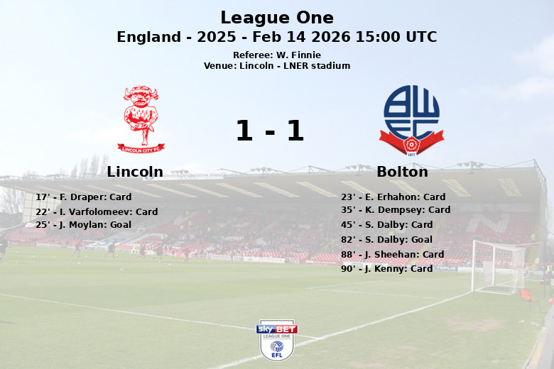 Lincoln, Inglaterra – Em uma partida disputada no LNER Stadium, Lincoln City e Bolton Wanderers empataram em um confronto cheio de intensidade e cartões amarelos. O encontro, correspondente à 32ª rodada da League One, Temporada 2025, viu o Lincoln abrir o placar aos 25 minutos com um gol de J. Moylan, assistência de R. Hackett-Fairchild.