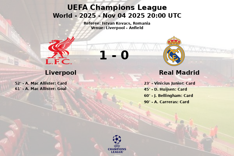 Liverpool, Reino Unido – O Liverpool venceu o Real Madrid em um jogo disputado em Anfield, válido pela fase de grupos da UEFA Champions League. O encontro, arbitrado pelo romeno Istvan Kovacs, foi marcado pela intensidade e luta no meio-campo.