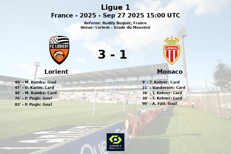 O Lorient derrotou o Monaco com um placar final de 3 a 1 em uma partida disputada no Stade du Moustoir, correspondente à sexta rodada da Ligue 1. A partida, arbitrada por Ruddy Buquet, foi marcada pela intensidade e pelos cartões.