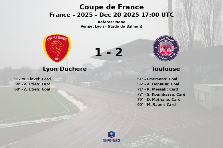 A partida, realizada em 20 de dezembro de 2025, foi marcada pela posse de bola superior do Toulouse (68%) e maior ameaça ofensiva, refletida em seus 13 chutes, 5 dos quais foram no alvo. O Lyon Duchère, por sua vez, lutou intensamente, mas só conseguiu gerar 3 chutes, com um no alvo.
