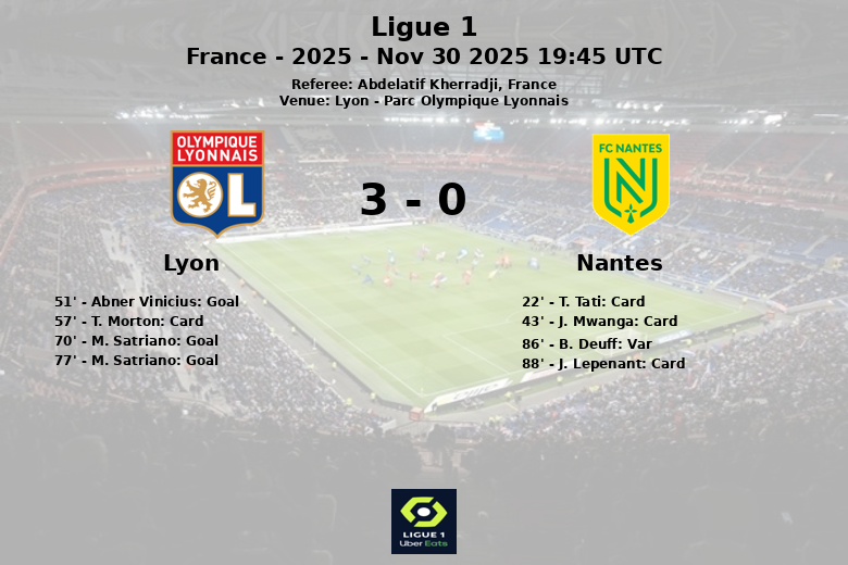 Lyon, 30 de novembro de 2025 – Em um confronto disputado no Parc Olympique Lyonnais, o Lyon derrotou o Nantes com autoridade, demonstrando sua superioridade em um jogo marcado pela posse de bola e eficiência ofensiva. O placar final refletiu o domínio da equipe da casa, especialmente após a expulsão de um jogador do Nantes no primeiro tempo.