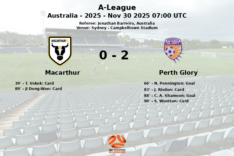 Sydney – Em uma partida correspondente à sexta rodada da A-League, temporada 2025, o Perth Glory derrotou o Macarthur no Campbelltown Stadium. Sob a arbitragem de Jonathan Barreiro, o jogo foi caracterizado por alta intensidade e momentos de tensão, refletidos nos quatro cartões amarelos mostrados ao longo do encontro.