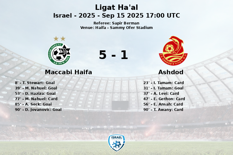 Haifa, Israel – O Maccabi Haifa derrotou o Ashdod em um jogo vibrante no Sammy Ofer Stadium, no âmbito da terceira rodada da Ligat Ha’Al. A partida, apitada por Sapir Berman, caracterizou-se por um ritmo de jogo elevado, numerosos gols e um número notável de advertências.