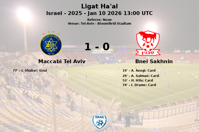 Tel-Aviv, Israel – Em uma partida disputada no Bloomfield Stadium, o Maccabi Tel Aviv venceu o Bnei Sakhnin por 1 a 0 na 18ª rodada da Ligat Ha’al. O domínio do Maccabi Tel Aviv foi evidente ao longo do confronto, refletido em seus 72% de posse de bola. Apesar de gerar inúmeras oportunidades, com 15 chutes no total, a precisão não foi seu forte, com apenas 2 chutes direcionados ao gol adversário. O único gol da partida aconteceu aos 77 minutos, marcado por I. Shahar após assistência de R. Revivo.