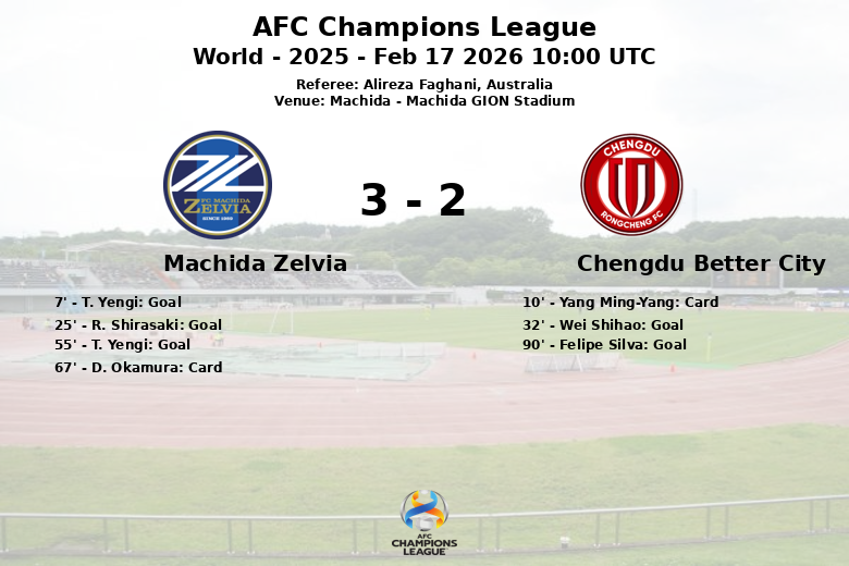 Machida, Japão – Em uma partida cheia de ação realizada no Machida GION Stadium, o Machida Zelvia triunfou sobre o Chengdu Better City com um placar final de 3-2, em um jogo correspondente à Liga dos Campeões da AFC. A partida, arbitrada por Alireza Faghani da Austrália, manteve os torcedores à beira de seus assentos até o último minuto.