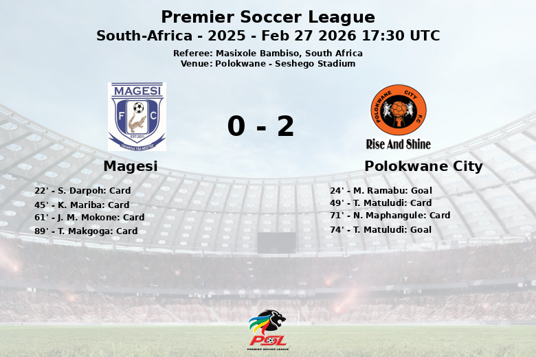 O Polokwane City ampliou a vantagem aos 74 minutos com um gol de T. Matuludi. Em termos de remates, o Polokwane City demonstrou maior agressividade ofensiva, com 14 tentativas (4 no alvo e 5 para fora) contra 7 do Magesi (2 no alvo e 4 para fora). O domínio em faltas também foi para o Polokwane City com 12 faltas contra 8 do Magesi. A partida terminou com um resultado favorável ao Polokwane City, que soube aproveitar as suas oportunidades e manter o controle do jogo.